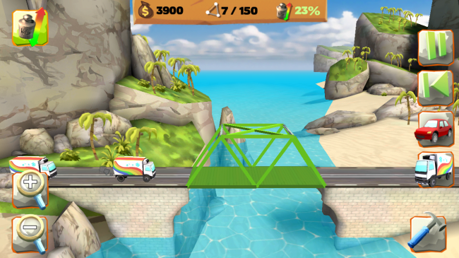 Deine Aufgabe ist ja hinlänglich bekannt: Eine Autokolonne will eine Schlucht überqueren und du musst dafür sorgen, dass du eine stabile Brücke baust, damit die Autos unbeschadet auf die andere Seite gelangen. Dazu gilt es, mit dem Finger Brückenteile auf dem Bildschirm aufzuziehen. Eine einfache Brücke aus einem Segment ohne zusätzliche Stützpfeiler ist dabei kaum ausreichend, um das Gewicht der Auto- oder gar LKW-Kolonnen tragen zu können. Deshalb musst du immer aufwändigere Konstruktionen erstellen. Mit Verzweigungen, Trägern und härteren Baumaterialen, mit Betonpfeilern und Stahlseilen verstärkst du die Brückenkonstruktion und sorgst dafür, dass die Brücke beim Test nicht einstürzt. Bei größeren Schluchten musst du sogar Zwischenpfeiler einplanen, damit die Brücke stabil bleibt. Falls du irgendwann einmal nicht mehr weiter weißt, wird dir das integrierte Tutorial hilfreiche Tipps geben.