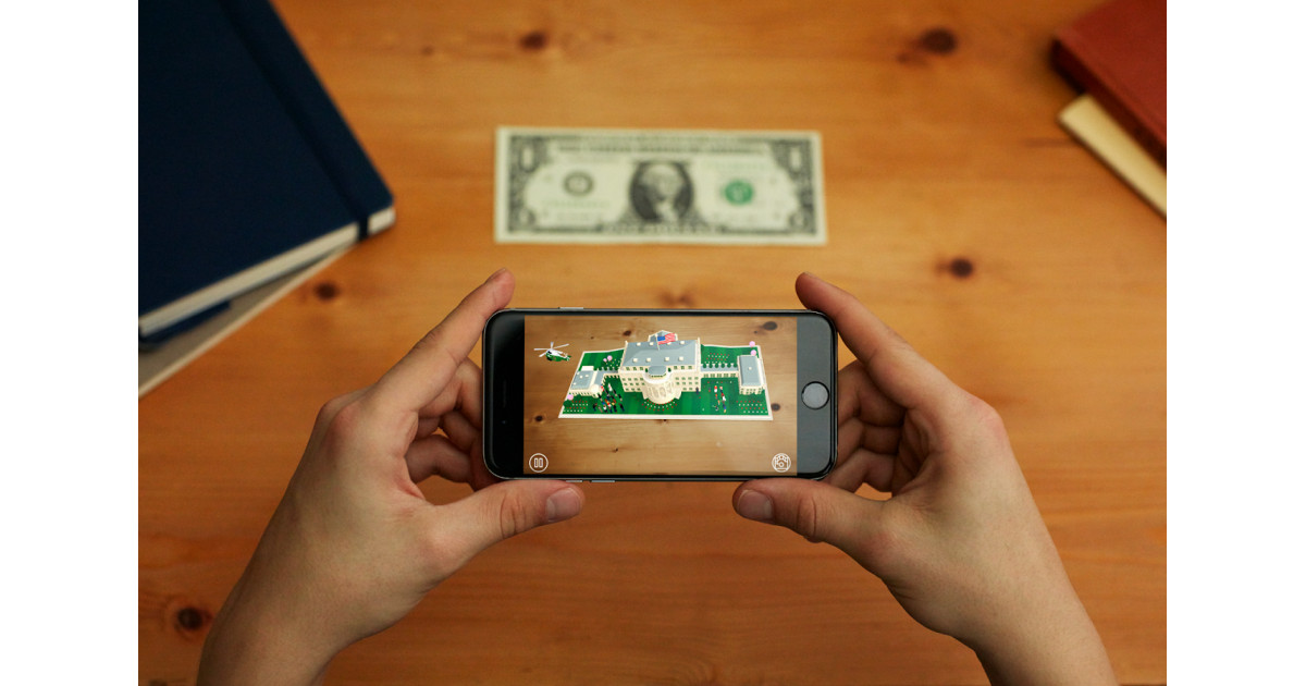 Zusätzlich zu der App benötigst du einen 1-Dollar-Geldschein (oder halt ein Bild davon). Wenn du die Kamera deines Smartphones auf das Porträt George Washingtons auf diesem Schein richtest, kannst du beobachten, wie das Weiße Haus auf dem Geldschein errichtet wird.