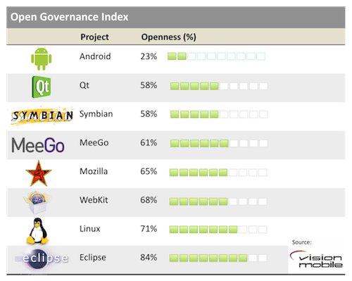Einer Studie von VisionMobile über den tatsächlichen “Offenheits-Grad” von Open-Source-Plattformen zufolge schneidet Android diesbezüglich schlecht ab, berichtet pressetext.com. Acht Projekte wurden auf die Erfüllung der Open-Source-Prinzipien untersucht – darunter auch Eclipse, Linux-Kernel und Firefox. Unterstützt wurde die Untersuchung auch von der EU.