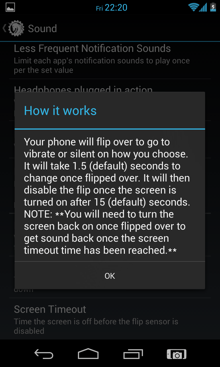 Egal ob in der Schule, in einem Meeting oder bei einem Date, es gibt viele Situationen, wo es eher unangenehm ist, wenn das Smartphone plötzlich laut klingelt oder die ganze Zeit Benachrichtigungstöne aussendet. AOKP bietet die Option, das Smartphone, sobald es auf das Display, also „Face Down“, auf den Tisch gelegt wird, auf Vibration oder komplett lautlos zu schalten. Um den Lautlosmodus wieder zu verlassen, muss das Smartphone lediglich mit dem Display nach oben zeigend einmal entsperrt werden.