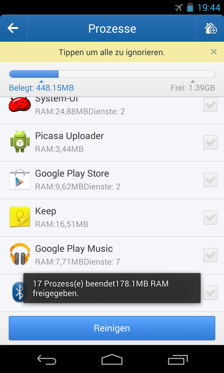 Tippen Sie anschließend am unteren Bildschirmrand die Schaltfläche „Reinigen“ an, um die ausgewählten Apps zu beenden.