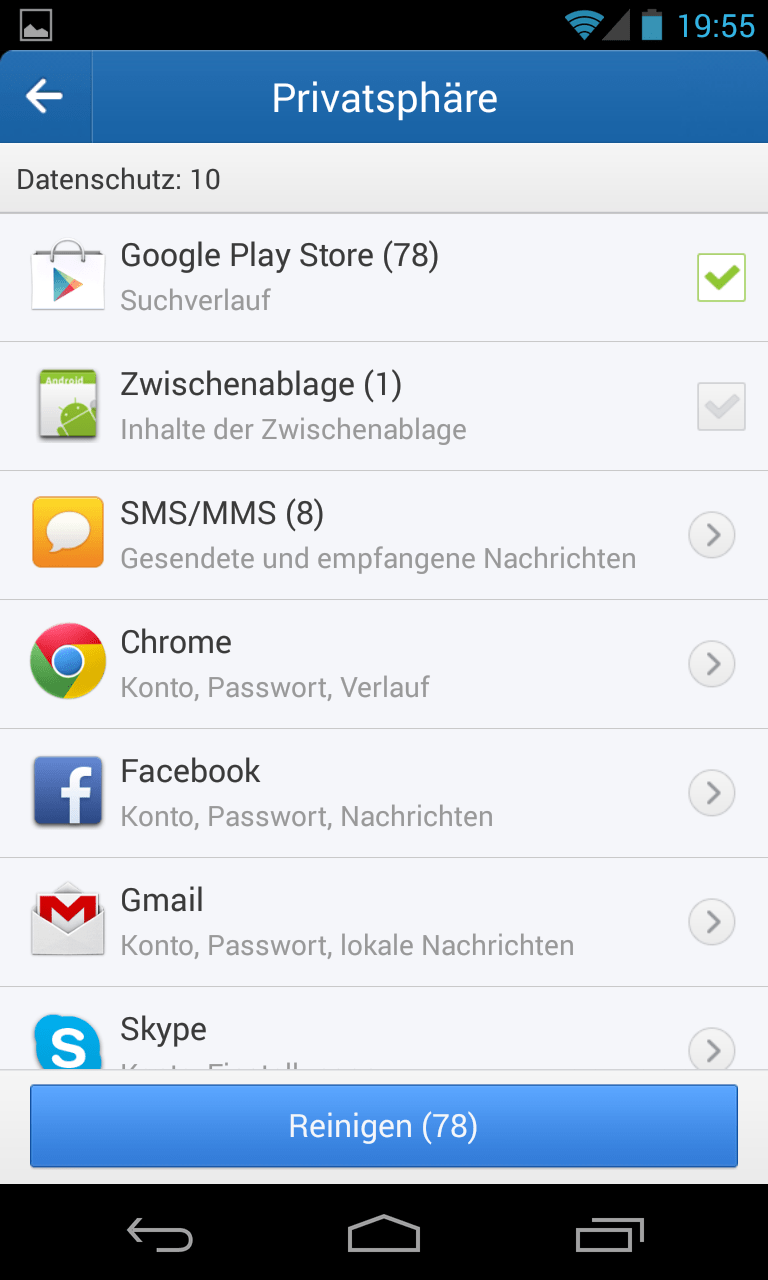 Wählen Sie zunächst mit Bedacht die Informationen aus, die das Programm löschen soll. Und tippen Sie dann die „Reinigen“-Schaltfläche am unteren Bildschirmrand an.