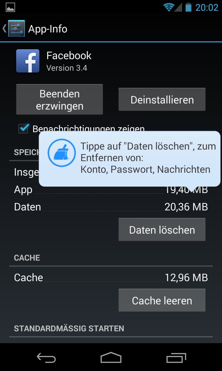 Bei Programmen wie Facebook, YouTube, Skype und Google+ bringt die App Sie in das „App- Info“-Fenster des Betriebssystems, wo Sie die Schaltfläche „Daten löschen“ antippen müssen.