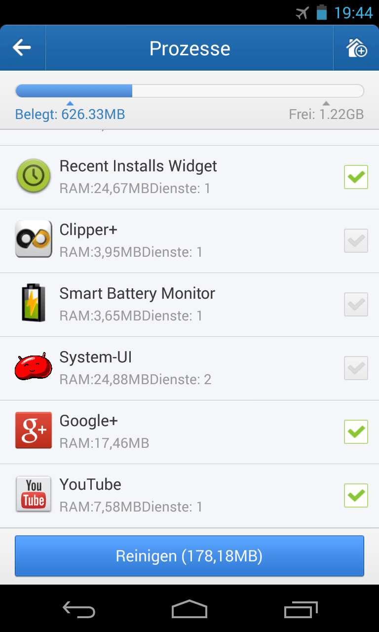 Mit der Clean-Master-Funktion „Prozesse“ können Sie Apps beenden, die im Hintergrund laufen. Eigentlich sollte dies gar nicht nötig sein. Denn das Betriebssystem Android kümmert sich theoretisch selbst darum. Allerdings gibt es in der Praxis durchaus Situationen, in denen Sie durch das manuelle Beenden von Apps die Arbeitsgeschwindigkeit Ihres Smartphones oder Tablets etwas erhöhen können. Seien Sie dabei bitte jedoch zurückhaltend: Bei etlichen Apps gibt es gute Gründe dafür, dass sie im Hintergrund laufen.