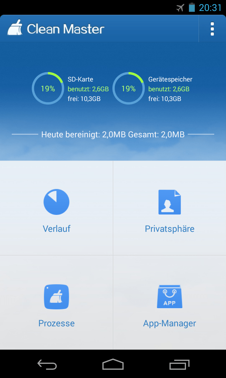 Clean Master räumt Ihr Smartphone auf. Dabei kümmert sich das Programm besonders um diejenigen Ecken, in denen das Betriebssystem ein wenig nachlässig ist. Clean Master löscht beispielsweise die Zwischenspeicher der installierten Apps sowie Überbleibsel von deinstallierten Programmen. Clean Master kann auch Apps beenden, die im Hintergrund laufen. Vorsichtig eingesetzt, verbessert diese Funktion die Geschwindigkeit Ihres Smartphones. Und nicht zuletzt schützt Clean Master Ihre Privatsphäre – indem die App unter anderem den Suchverlauf und die Kennwörter des Browsers löscht sowie den Inhalt der Zwischenablage.