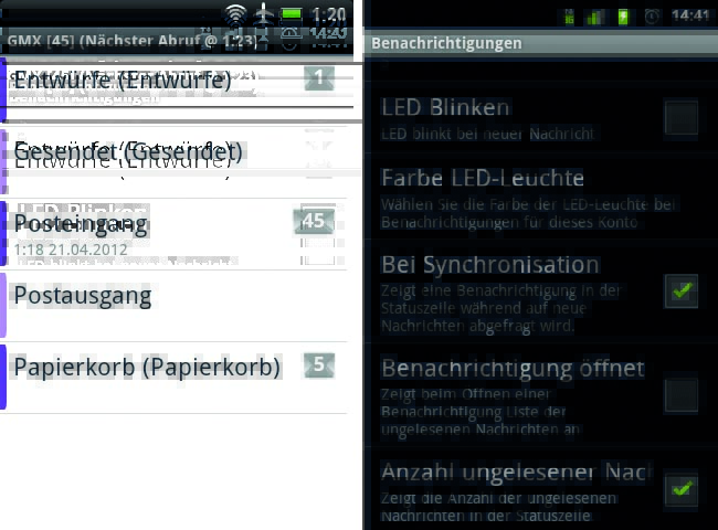 Sehr praktisch: Treffen neue Nachrichten ein, so zeigt K-9 ihre Anzahl und ihre Betreffzeilen in der Statuszeile an. Natürlich nur, wenn ihr das möchtet. Auch mit Vibrieren oder LED-Blinken kann das Programm euch auf neue Nachrichten aufmerksam machen.