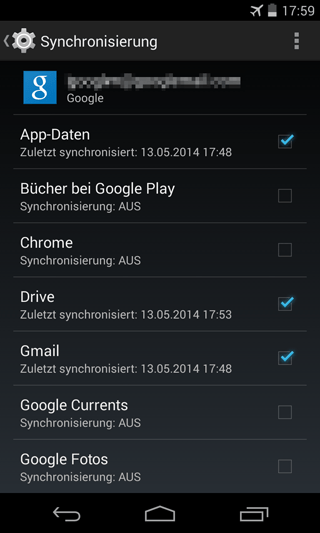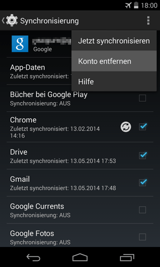 … abgeglichen werden sollen (beispielsweise die Kalender-, Kontakte-, Notizen-, Drive- und Gmail-Daten). – Rufe im Fenster „Synchronisierung“ den Menüpunkt „Konto entfernen“ auf, wenn du dieses Konto wieder von deinem Smartphone löschen möchten.