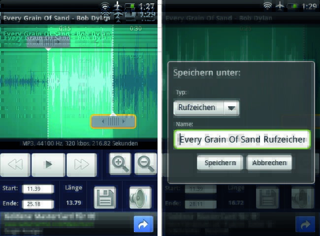 Wählt im Hauptfenster ein Musikstück aus, indem ihr sein Pfeilsymbol antippt und dann den Menüpunkt „Bearbeiten“ verwendet. Anschließend könnt ihr im Bearbeitungsfenster mit den beiden grauen Schiebereglern festlegen, welcher Ausschnitt des Songs als Klingelton dienen soll.