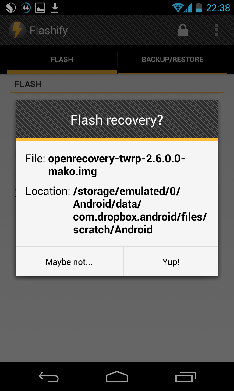 Vor dem Flashen von Recovery oder Boot Image sollte ein Backup angelegt werden. Unter dem Reiter „Backup/Restore“ können diese jeweils über den Punkt „Backup […]“ auf dem Gerät oder in der Dropbox gesichert werden.