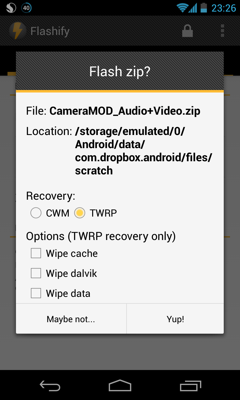 Beim Flashen von Mods im Zip-Format stehen unter der TWRP-Recovery zusätzlich Optionen zum Löschen von Cache, Dalvik oder Daten zur Verfügung. Dies sollte aber nur von erfahrenen Nutzern angewendet werden.