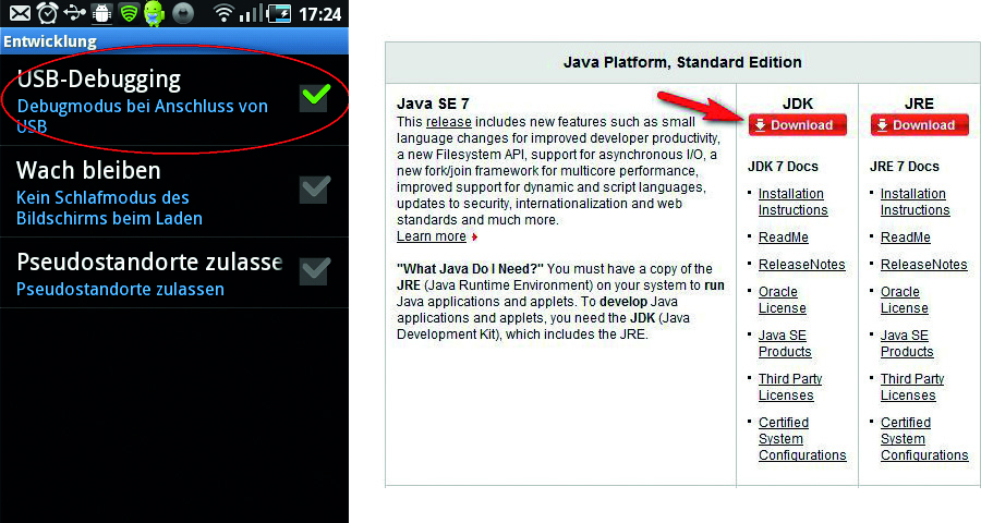 Von bit.ly/jdkdown laden und installieren Sie daraufhin das Java Development Kit in der aktuellen Version. Dasselbe machen Sie mit dem Android Developer SDK, zu finden unter: http://bit.ly/sdkdown
