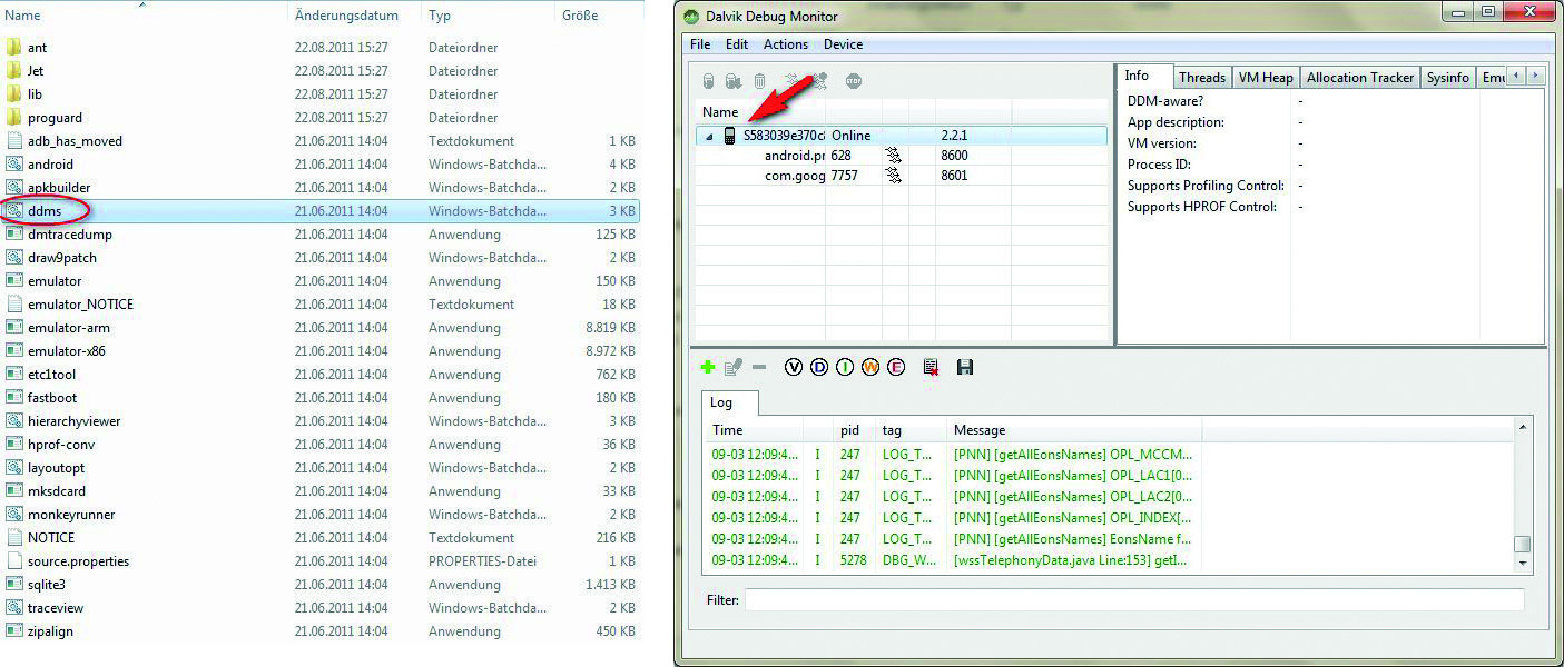 Verbinden Sie nun ihr Smartphone über USB mit dem PC. Danach starten Sie die Datei \tools\ddms.bat aus dem Verzeichnis, in dem Sie das Androit SDK installiert haben.