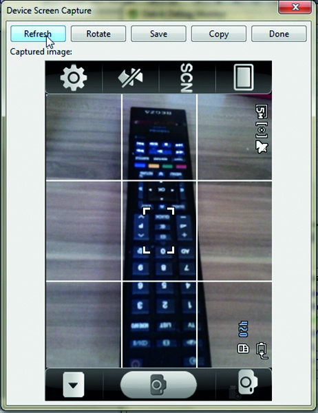 Über die Schaltfläche ‚Refresh‘ wird das aktuelle Bild Ihres Droiden auf dem Bildschirm repliziert, das Sie dann speichern können. Sogar das Bild der Kamera-App fangen Sie so ein.