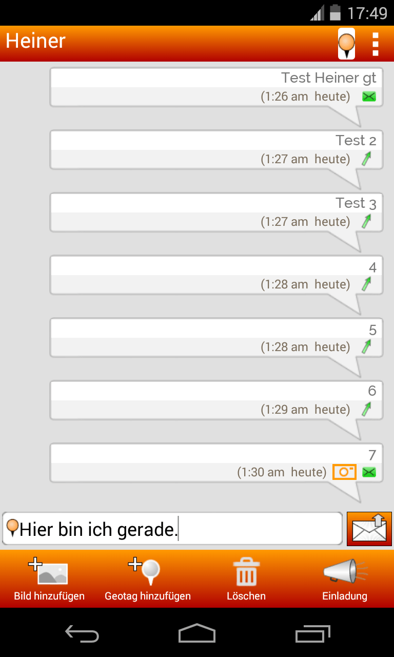 Soll die Nachricht neben dem eingegebenen Text auch Informationen über Ihren gegenwärtigen Aufenthaltsort enthalten? Dann tippen Sie die Schaltfläche „Geotag hinzufügen“ an. Im Dialogfenster „Geotag wählen“ können Sie festlegen, wie lange und wie oft die App die Positionsangaben aktualisieren soll. Ziehen Sie den Schieberegler „Position wie lange aktualisieren?“ auf die Einstellung „Einmalig“, wenn Sie lediglich einmal eine Positionsangabe verschicken möchten. Die Positionsangaben, die Sie von Freunden empfangen haben, können Sie auf einer Google-Maps-Karte anzeigen, indem Sie rechts oben die Positionsmarker-Schaltfläche antippen.