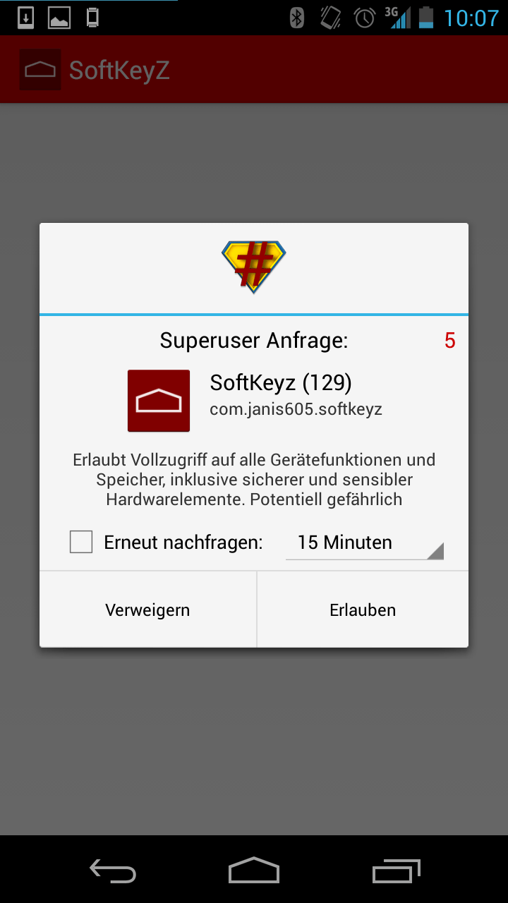 Erlauben Sie SoftKeyZ den Zugriff auf Root-Berechtigungen, daraufhin finden Sie sich im Hauptmenü der App wieder. Scollen Sie in die untere Hälfte des Bildschirmes, hier