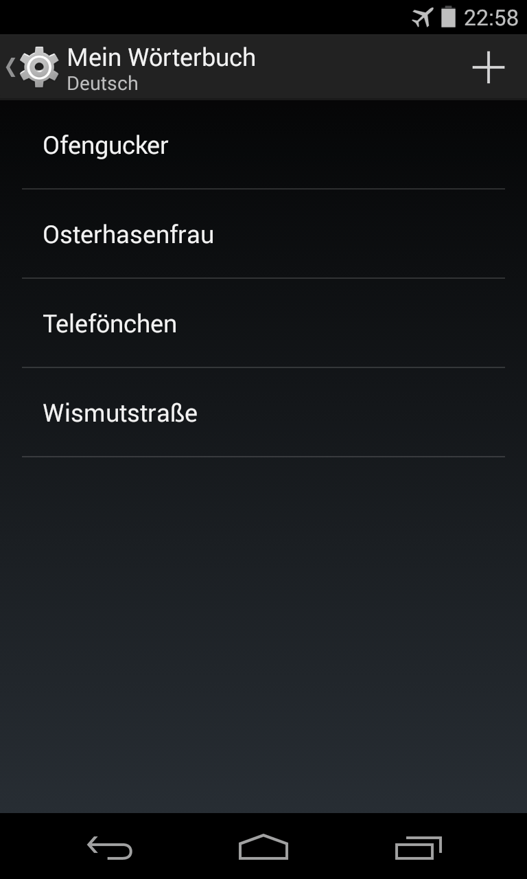 Haben Sie ein falsch geschriebenes Wort versehentlich in das Wörterbuch aufgenommen? Dann tippen Sie in den Einstellungen unter „Sprache & Eingabe“ die Schaltfläche „Mein Wörterbuch“ (oder „Persönliches Wörterbuch“) an.  Im Fenster „Mein Wörterbuch“ werden die hinzugefügten Wörter aufgelistet. Um ein Wort zu entfernen, tippen Sie erst das Wort an und dann die Papierkorb-Schaltfläche.  Tippen Sie rechts oben auf die „+“-Schaltfläche, um ein neues Wort hinzuzufügen.