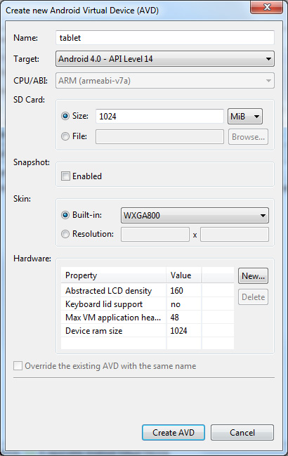Hier legst du die Facts deines Android 4.0 Tablets fest. Der Name ist egal, im Feld Target wählst du “Android 4.0 – API Level 14” aus. Bei SD-Card kannst du die größe der SD-Karte im Gerät festlegen. z.B “1024” für 1 Gigabyte. Nun zum wichtigsten Feld: Unter “Built-in:” kannst du die Auflösung festlegen und somit entscheiden ob du ein Android Smartphone oder Tablet testen möchtest.