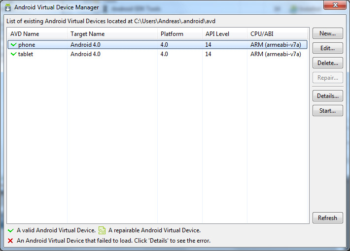 Erstelle nun den Emulator, indem du auf “Create AVD” klickst. - Fünfter und letzter Schritt: Wähle den soeben erstellen Eintrag aus und klicke rechts auf “Start…“. Das Android System fährt hoch und ist nach ca. 30 Sekunden einsatzbereit! Das System läuft auch auf schnellen PCs sehr unperformant, das liegt am Emulator. Ausprobieren kannst du trotzdem schon alle Features!