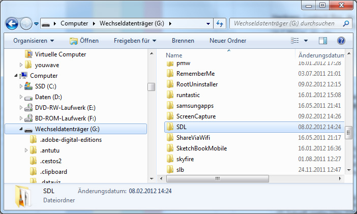 Habt ihr euer Smartphone oder Tablet mit eurem PC verbunden, müsst ihr anschließend das zuvor heruntergeladene und entpackte Windows 95 Image, also den Ordner “SDL”, in den Stammordner eurer SD-Karte kopieren (siehe Screenshot unten). Auf Geräten ohne SD-Karte, wie etwa dem Nexus S oder dem Galaxy Nexus, müsst ihr den Ordner “SDL” einfach in den Stammordner eures internen Speichers kopieren.