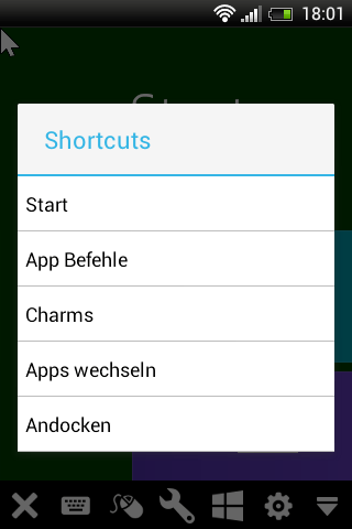 Tippen Sie unten in der Werkzeugleiste das Windows-8-Symbol an, um das Menü mit den Windows-8-Spezialfunktionen zu öffnen. Die Schaltfläche „Start“ lässt das Startfenster von Windows erscheinen. Die Schaltfläche „App Befehle“ ruft das Menü der zurzeit verwendeten Windows-App auf.