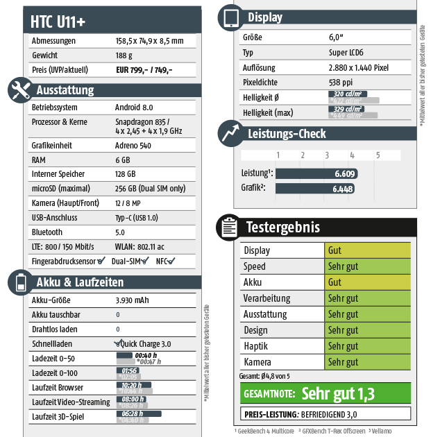 Im Vergleich zum Anfang 2017 gezeigten Topmodell halten sich die Neuerungen dennoch in Grenzen. Das zeigt zwar, dass HTC mit dem U11 sehr früh dran war, aber eben auch, dass die Plus-Variante kaum nennenswerte Upgrades bietet. Als Antriebseinheit fungiert nach wie vor der Snapdragon 835, der aber auch nach über einem Jahr noch nicht zum alten Eisen gehört. Im Gegenteil: Die Messwerte können sich sehen lassen und platzieren das U11+ direkt im Spitzenfeld. Unser Testmodell konnte zudem auf starke 6 GB RAM zurückgreifen, als Festspeicher stehen 128 GB zur Verfügung. Unter der Haube wurde ansonsten nur dem Bluetooth-Modul ein Update verpasst, gefunkt wird nun mit der Version 5.0. Und, selbstverständlich: Die erweiterte Größe des Bildschirms erfordert eine Anhebung der Akkukapazität. Statt 3.000 mAh wie beim U11 gibt es nun 3.930 mAh. Das macht allerdings keinen allzu großen Unterschied, wie unsere Messwerte belegen. Aufgrund des doch erheblich größeren Displays benötigt die Plus-Variante mehr Strom, was zur Folge hat, dass sich die Laufzeiten trotz der größeren Nennkapazität nur marginal unterscheiden. Beide Modelle erreichen eine Videolaufzeit von etwa acht Stunden und ermöglichen es dem Nutzer, über zehn Stunden lang zu surfen.