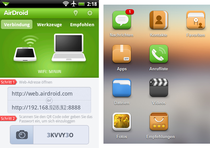 Um die Funktionen von AirDroid zu nutzen, startet ihr die App auf dem Smartphone. Und ruft auf dem PC im Browser die Seite web.airdroid.com auf. Gebt anschließend im Browser in das Feld „Passwort“ das Kennwort ein, das auf dem Smartphone zu sehen ist.