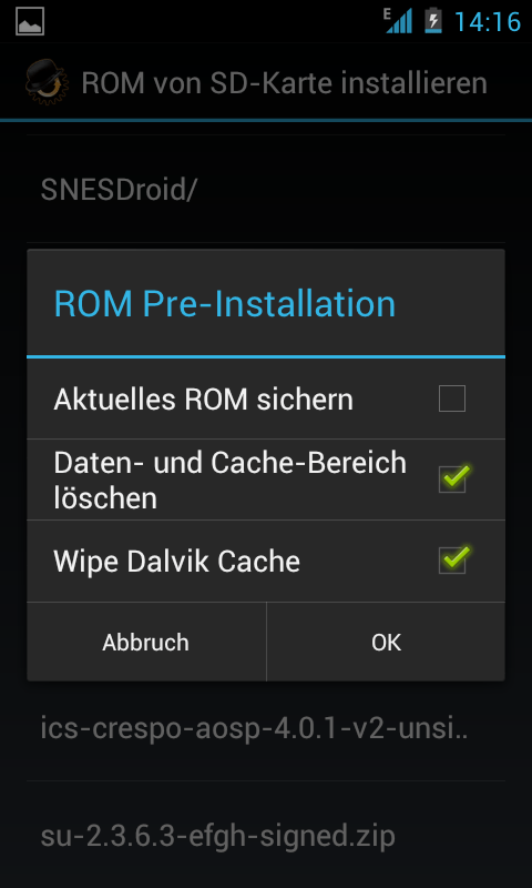 Jetzt wird es interessant. Trennt euer Nexus S vom PC und öffnet erneut den ROM Manager. Tippt dort auf den Menüpunkt „ROM von SD-Karte installieren“, sucht die zuvor auf den internen Speicher des Nexus S kopierte Datei „ics-crespo-aosp-4.0.1-v2-unsinged.zip“ und tippt darauf. Setzt im folgenden Fenster die Häkchen bei „Daten- und Cache-Bereich löschen“ sowie bei „Wipe Dalvik Cache“ und tippt danach auf OK.