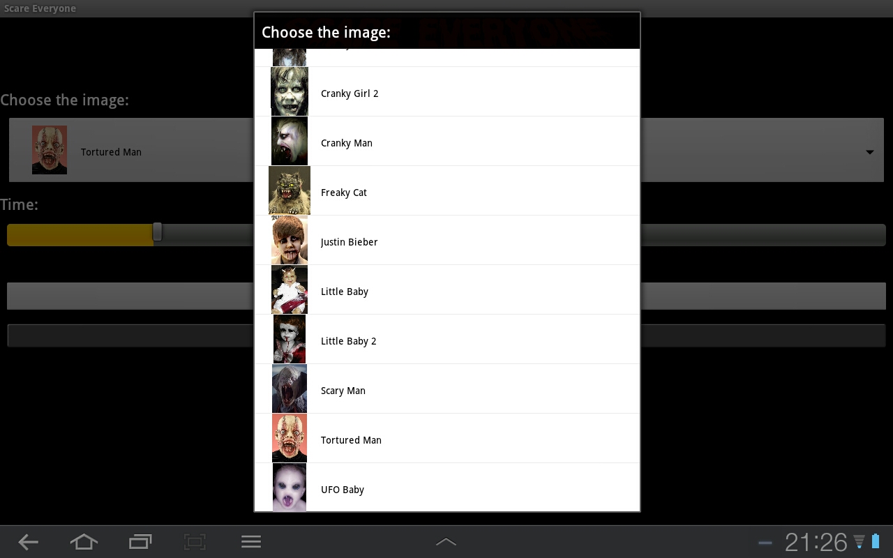 Du musst lediglich diese App mit dem etwas eigenwilligen Namen installieren. Aber auch wenn der Titel ein wenig holprig klingt, kannst du dir schon denken, was das erklärte Ziel dieser App ist. Du kannst damit jeden erschrecken, auch deinen neckischen Freund. Und lass dir versichern: Selbst dem unerschrockensten Rocker wird nach diesem Schrecken das Herz in die Hose rutschen. Und dein Freund ist ja nur ein aufgeblähter Gockel, der diese Lektion ganz einfach mal verdient. Also, nichts wie los! Du startest die App und wählst gleich einmal aus dem Dropdown-Menü einen dieser liebreizenden Zeitgenossen aus. Egal, ob du Angry Dog wählst, Cranky Girl oder UFO Baby, keiner der hier zur Auswahl Stehenden ist eine Schönheit, nach eingehender Betrachtung wirst du sogar eher vom Gegenteil überzeugt sein. Ja, du gehst sogar soweit, sie als abscheuliche Monster zu bezeichnen.