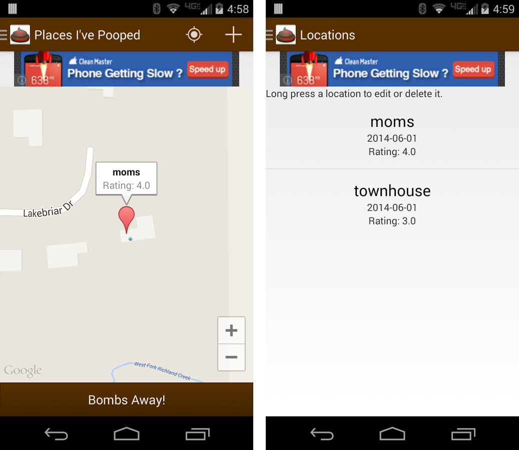 Wer kann sich schon merken, wo er/sie bereits überall hin gekackt hat? Das ist eine durchaus wichtige Frage. Denn nicht immer möchte sich der geneigte Kackende an den Orten seiner Taten erneut einfinden. Zum Glück gibt es Smartphones und diese Nobelpreis-verdächtige App. (kostenlos, ohne In App Käufe).