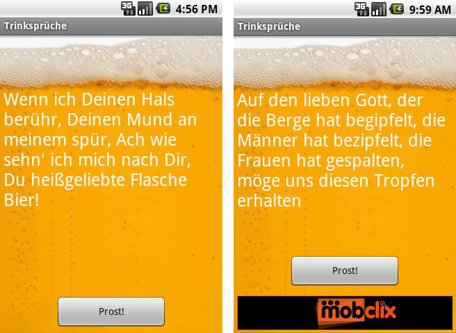 Trinksprüche – so lautet der Name dieser App. Kurz, prägnant und auch noch 3,0-Promille-kompatibel. Die Zielklientel erschließt sich bereits bei der Lektüre der App-Beschreibung im Playstore. Zutiefst betrübt stellen wir fest, dass bereits dort jegliches Niveau nebst Orthographie mehr oder minder würdevoll zu Grabe getragen wurde. Ähnlich literarisch geben sich die Inhalte. Die geradezu götzenhafte Verehrung einer Bierflasche steht bereits messerscharf vor der Kirchensteuerpflicht. Deren Inhalt, der hektoliterweise durch europäische Kehlen rinnt, trübt wie bei jeder anderen allzu exzessiven Religionsausübung den Blick für die Realität.