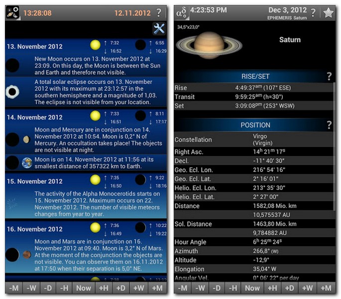 Mit dieser App haben die Entwickler das Kunststück vollbracht, die gesamte komplexe Welt der Astronomie auf mobile Endgeräte zu portieren, ohne dabei trotz des riesigen Umfangs die Übersichtlichkeit und Benutzerfreundlichkeit aus den Augen zu verlieren. Eine zoombare Himmelskarte zeigt die aktuelle Position der Gestirne. Wer wissen möchte, was er gerade am Himmel sieht, hält sein Smartphone im sogenannten Live Modus ans Firmament und schnell hat die App die passenden Informationen parat. Ein integrierter Kalender nennt uns alle Himmelsereignisse der nächsten 7 bis 31 Tage und beschreibt diese genau. Generell gilt, dass diese App für alles, was sich in der Welt der Sterne tut, umfassende Erklärungen liefert und genaue Berechnungen für die Jahre von 1900 bis 2100 mit an Bord hat.