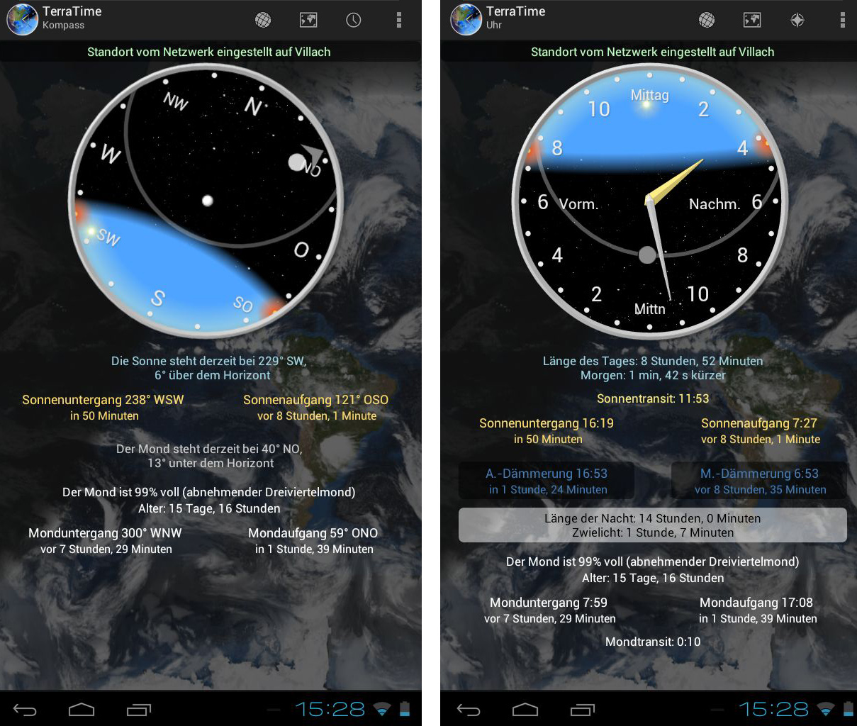 Dass die unendlichen Weiten des Weltalls einen ganz besonderen Reiz auf die Menschheit ausüben, wissen nicht nur Fans der Serie Star Trek. Die App TerraTime befördert ihre Nutzer innerhalb weniger Sekunden direkt in den Orbit. In der Hauptansicht befinden sich Satellitenbilder der Erde, welche nach Belieben gezoomt werden können. Durch Bewegen des Smartphones oder Tablets sowie durch Berührung der Touch-Oberfläche wird die Erde in die jeweilige Richtung gedreht. Dies gibt den Blick auf die andere Hälfte des Erdballs frei. Anhand der App lässt sich der natürliche Rhythmus von Tag und Nacht in unterschiedlichen Teilen dieser Welt mitverfolgen. Informativ: die TerraTime Uhr. Sie liefert Daten zu Sonnenauf- und Sonnenuntergang, Morgen- bzw. Abenddämmerung, Länge des Tages, Länge der Nacht, Mondphase und zeigt den Sonnentransit an. Außerdem findet man im Uhren-Menü auch eine Kompass-Funktion.