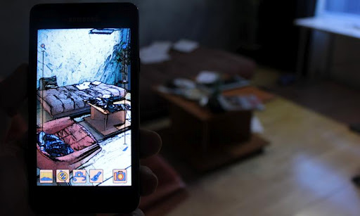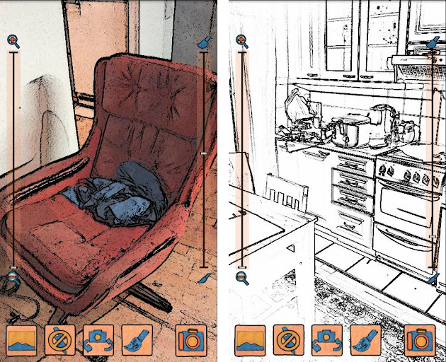 Wirklich praktisch: der Zeichentrick-Filter wird sofort aktiviert, also erkennt man gleich, wie das potentielle Cartoon-Foto aussehen wird. Im App Menü selbst kann man zwischen 5 unterschiedlichen Filtern wählen: Cartoon, Sepia, White Strokes, Dark Strokes und Colored Edges. Über zwei Balken, die sich am linken und rechten Bildrand befinden, kann man darüber hinaus den Zoom-Faktor und den Kontrast regulieren. So hat man also die Möglichkeit das Bild im Rahmen der vorgegebenen Effekte noch ein wenig individueller zu gestalten. Mit einem Mausklick aktiviert bzw. deaktiviert man den Blitz und wechselt die Kamera (Vorderseite/Rückseite). Über das App Menü kann man auch direkt in die Galerie einsteigen und sich die aufgenommenen Kunstwerke noch mal in Ruhe ansehen.
