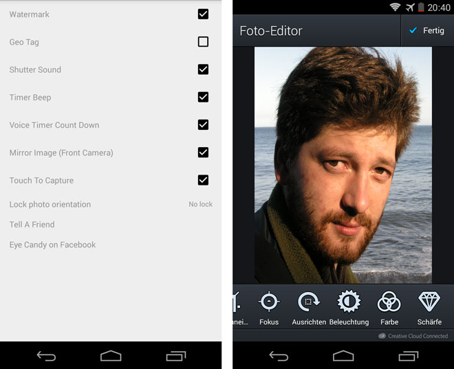 „Eye Candy“ ist eine Kamera-App, die hauptsächlich (aber nicht ausschließlich) für das Herstellen von Selbstporträts gedacht ist. An reinen Kamerafunktionen bietet die Software (fast) alles, was man von einer derartigen App erwarten könnte: also unter anderem einen Selbstauslöser, Orientierungsgitter, die Möglichkeit, zwischen den beiden Kameras umzuschalten, die Unterstützung von GPS-Koordinaten und eine Automatik, die Collagen aus mehreren Fotos anfertigt. Umso erstaunlicher, dass die App keine Möglichkeit bietet, die Auflösung für das Aufnehmen von Fotos zu verändern.