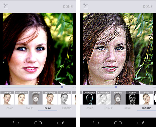 Ein Großteil der Filter verändert die Farbgebung der Fotos. Es gibt jedoch auch etliche Filter, die sich anderen Aufgaben widmen – die also beispielsweise die Fotos in Bleistiftzeichnungen oder Cartoons verwandeln, die Helligkeit, den Kontrast und die Bildschärfe verändern, einen Vignetteneffekt erzeugen oder die Bildinhalte verformen.
