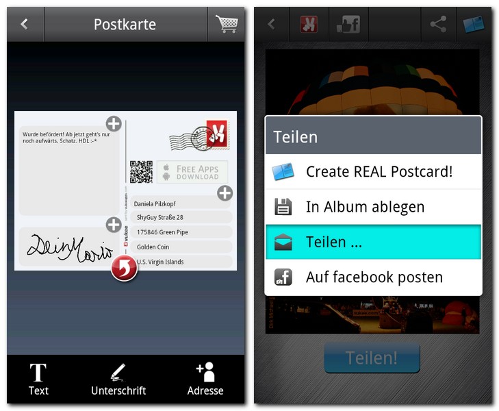 Bearbeitete Fotos können in sozialen Netzwerken geteilt und sogar als Postkarte versendet werden.