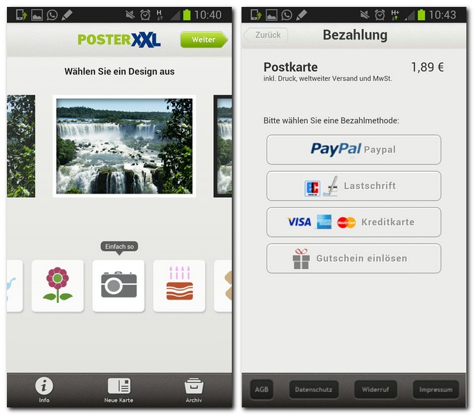 Nach der Eingabe der Adresse gilt es nur noch, die Zahlungsart zu wählen. Bezahlen kannst du per PayPal, Lastschrift oder mit der Kreditkarte. Schließlich wird die Karte angefertigt und versendet. Die App überzeugt durch einen schlichten Aufbau, sämtliche Schritte sind verständlich erklärt.