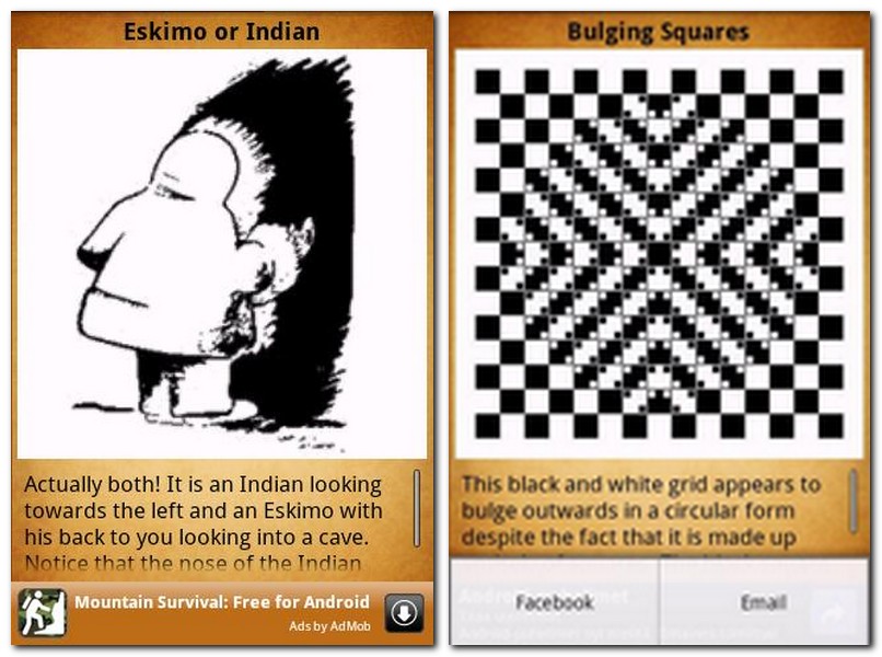 Im Gegensatz zu all den anderen Spielereien die ich zuvor aufgezählt habe, kostet euch die App nämlich gar nichts und ist damit eine der seltenen Ausnahmen im App Market, jedenfalls was diesen Bereich anbelangt. Der Entwickler hat in ihr 98 mehr oder weniger bekannte optische Illusionen gesammelt, die er anhand von Bildern dem Anwender zu Gemüte führt, wobei er in knappen – und leider ausschließlich englischen – Worten die jeweilige, optische Illusion zu erklären versucht. Dankenswerterweise fand er dabei sogar noch Zeit, eine Möglichkeit zum Teilen via Facebook und Mail vorzusehen – doch auch im Offline-Bereich kommt die App hervorragend an, sodass sie sich perfekt als Eisbrecher bei Geburtstagsfeiern und kleineren Festen anbietet.