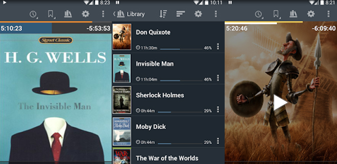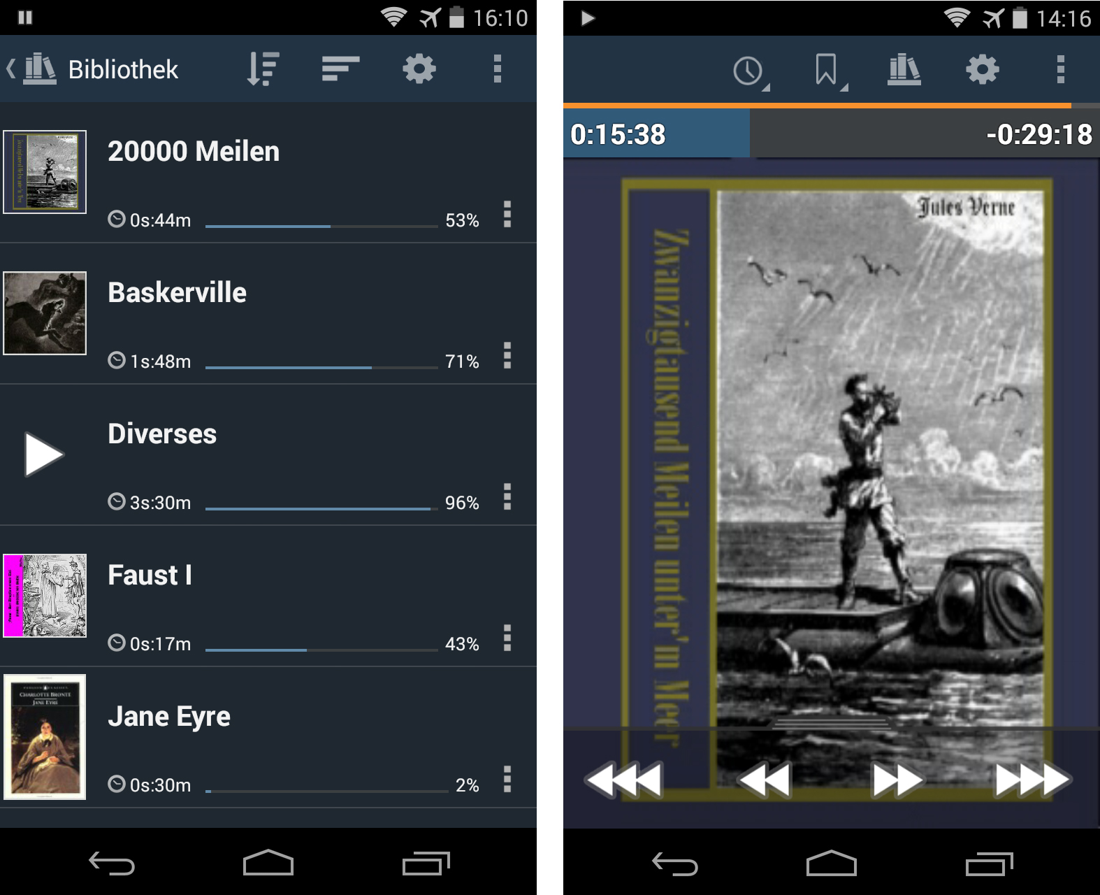 Die Bedienung der App ist sehr einfach: Wahlweise durch Wischgesten oder durch Antippen vonSchaltflächen spulst du in kleineren oder größeren Schritten durch die Bücher. Das Programm merkt sich sinnvollerweise automatisch, an welcher Stelle du das Abspielen eines Buches unterbrochen hast. Du darfst aber auch selber Lesezeichen setzen.