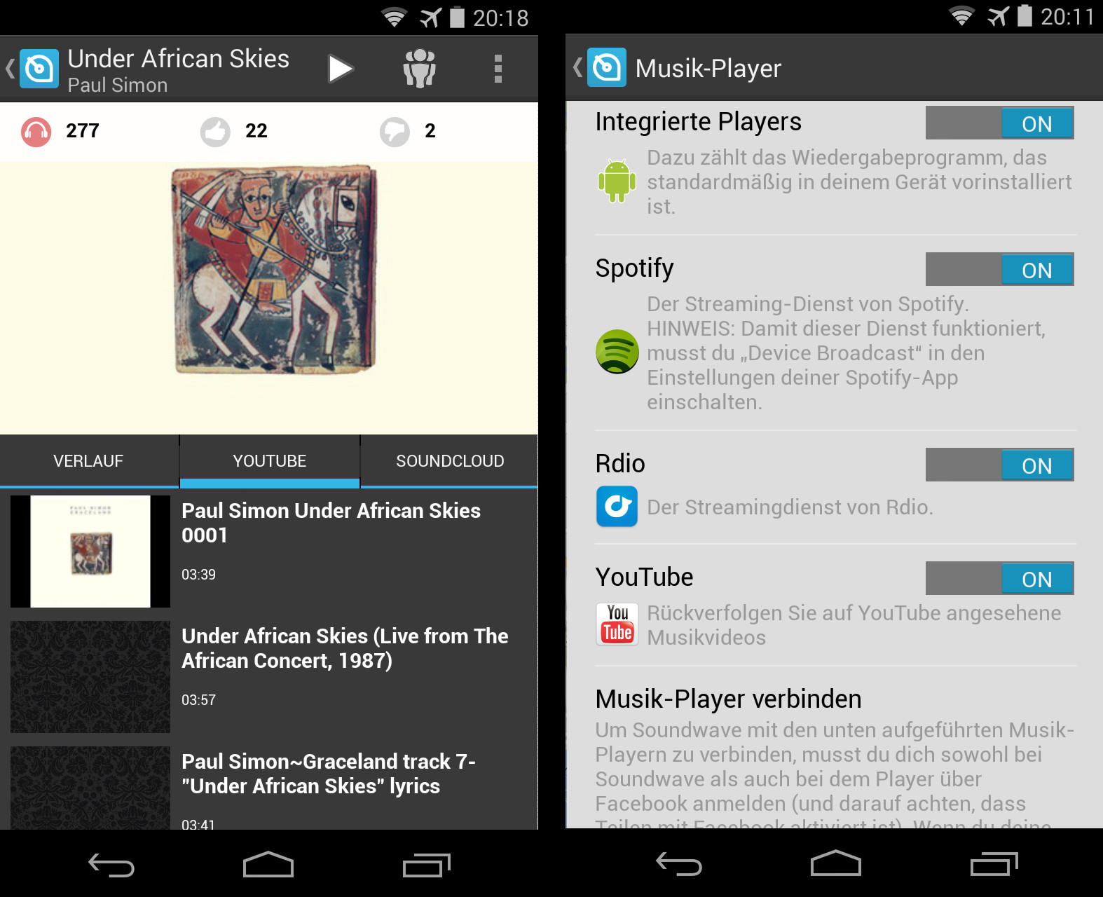 Die App unterstützt dabei die meisten vorinstallieren Musikabspielprogramme, diverse Streaming-Apps (beispielsweise Rdio) und auch YouTube. Allerdings wollte es uns im Test auf mehreren Geräten nicht gelingen, die App dazu zu bringen, Musikstücke von YouTube zur Kenntnis zu nehmen.