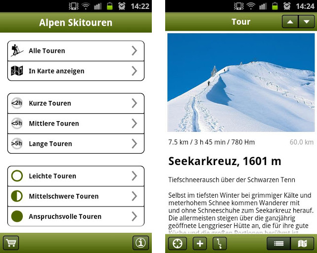 Diese App ist der richtige Begleiter bei Skitouren. Denn hier findest du nicht nur kurze, mittlere und lange Touren, du kannst auch nach leichten, mittelschweren und anspruchsvollen Touren selektieren. Besonders sinnvoll: Der Ski Tourenführer funktioniert auch offline, wenn man die Tourenkarte nebst Tourenbild zuvor heruntergeladen hat.