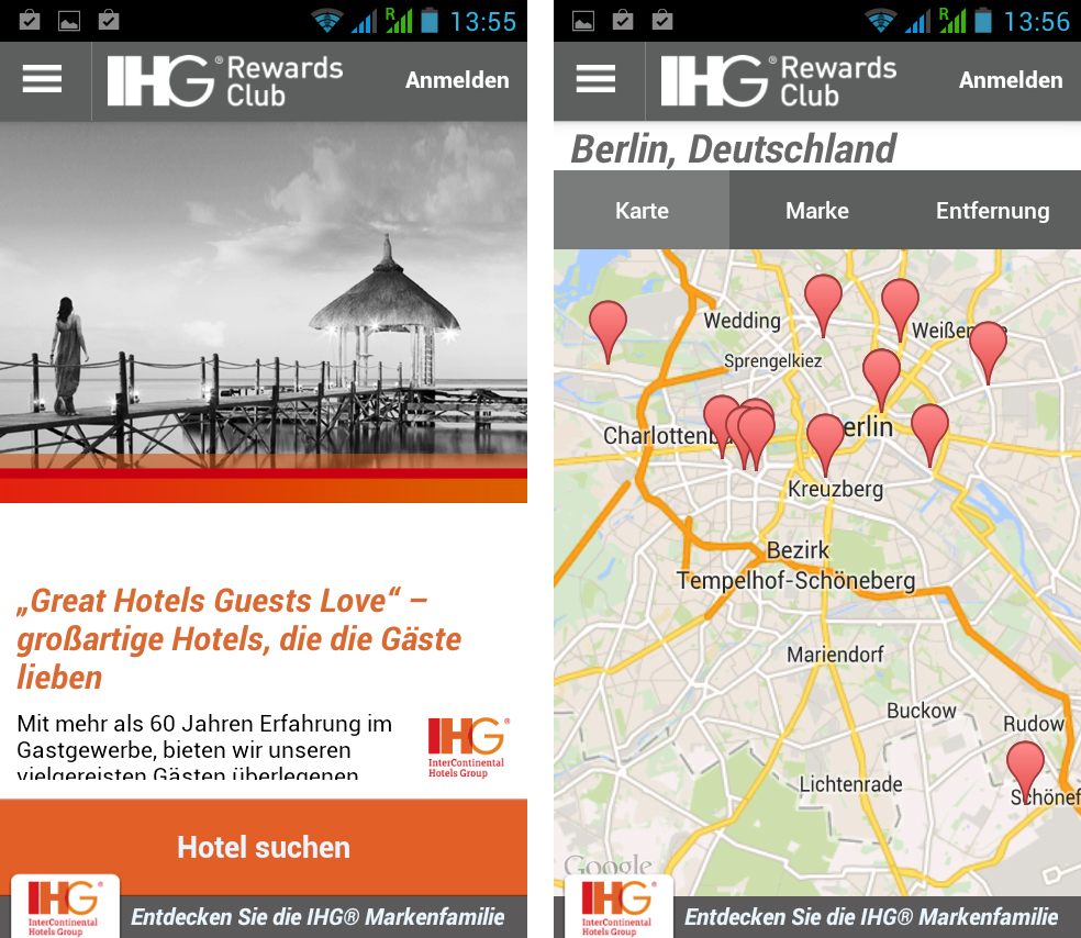 Hinter dem Kürzel „IHG® “ verbirgt sich die InterContinental® Hotels Group. Diese steht für weltweit mehr als 4.700 Hotels bekannter Marken wie etwa InterContinental® Hotels & Resorts, Holiday Inn® und Crowne Plaza®. Gäste erhalten mit der App Zugang zu exklusiven Angeboten sowie Unterstützung bei der Hotelsuche und beim Managen ihres Aufenthaltes „on the Go“.