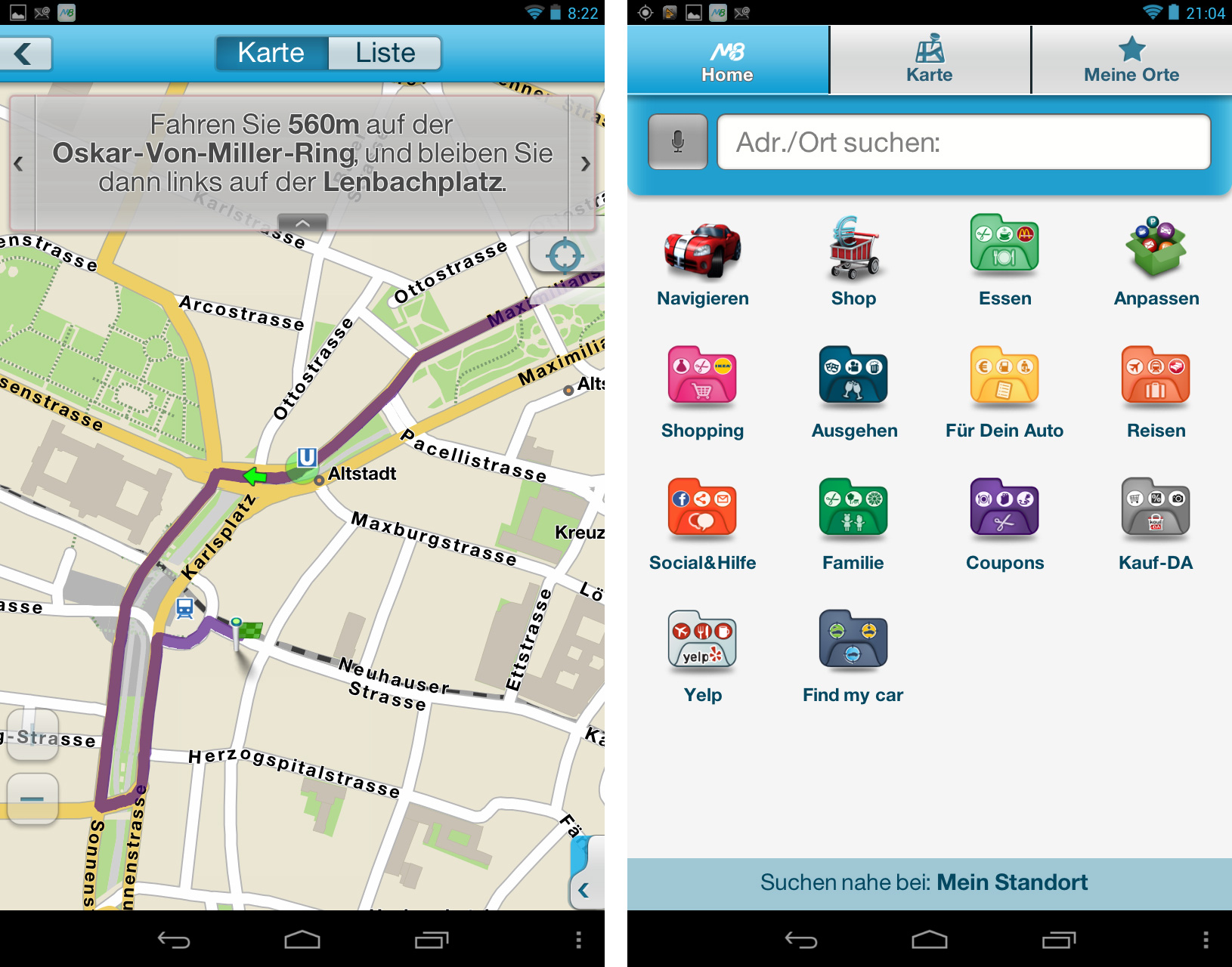 Das Navigationsprogramm „M8 – Das Mitdenk-Navi“ kennt die Straßen und Geschäfte von ganz Deutschland. Ihr Kartenmaterial und auch die Streckenberechnungen lädt die kostenlose App aus dem Internet herunter.