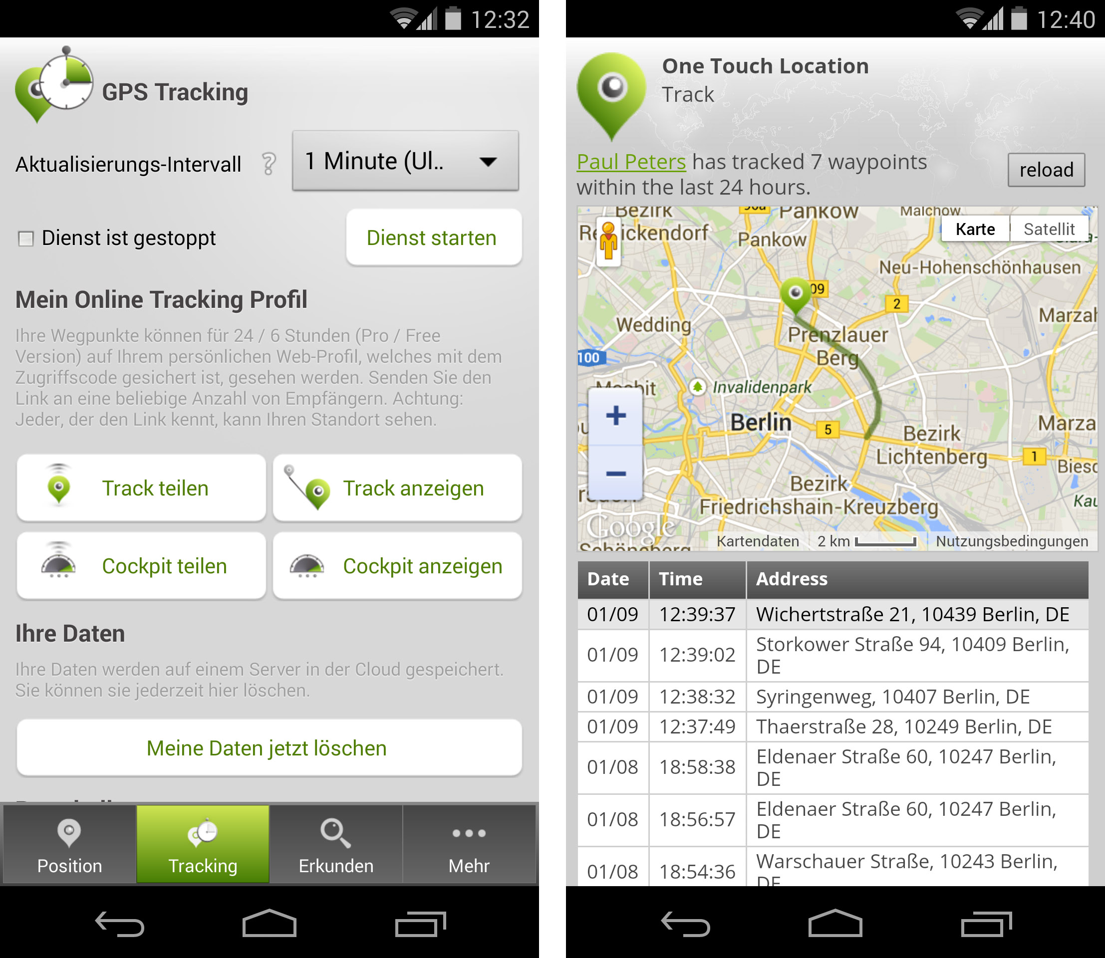 Bei aktiviertem Tracking können Sie sogar Ihre letzten Wegpunkte aufzeichnen und mit nur einem Klick per EMail, Facebook oder SMS teilen. Nach Auswahl des TrackingIntervalls sendet die App Ihren Standort in kontinuierlichen Abständen an einen passwortgeschützten Web Server, der Ihre Wegpunkte 6 Stunden in der kostenlosen und 24 Stunden in der PRO Version speichert. Über die App oder alternativ eine passwortgeschützte Website können Sie und Freunde, denen Sie Zugriff gewähren, so Ihren Track in Echtzeit einsehen.