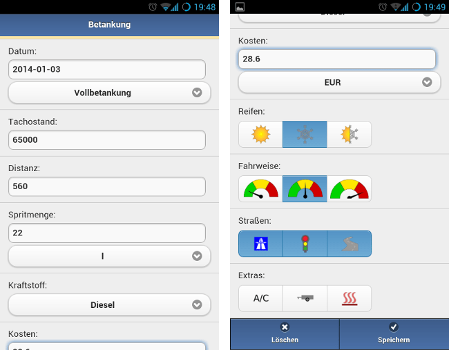 Beim nächsten Tanken fügst du einen Eintrag hinzu und trägst die Spritmenge nebst aktuellem Kilometerstand ein. Die seit dem letzten Mal zurückgelegte Distanz wird automatisch errechnet. Optional können der Rechnungsbetrag und Details wie Bereifung, Fahrweise und Straßenprofil angegeben werden.