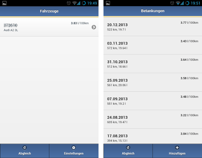 Offenbar hat man dabei in erster Linie an bestehende User gedacht, denn Benutzerkonto und Fahrzeuge lassen sich nur über die Website anlegen. Ist das geschehen und sind die Benutzerdaten in der App hinterlegt, bleibt diese mit dem Online-Konto synchron: Bereits eingetragene Betankungen können angesehen werden, zurückgelegte Wegstrecken und der jeweilige Verbrauch pro 100km werden angezeigt.