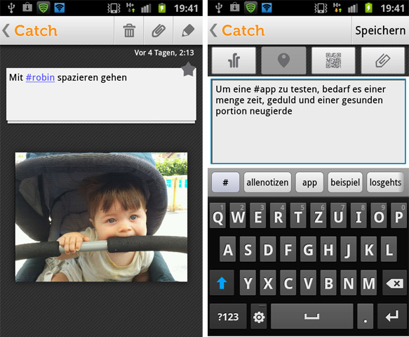 Also früher, ich mein jetzt so vor ein – zwei Jahren, da war es ja schon ganz schön mühsam, die Fortschritte der Kids in Wort und Bild festzuhalten. Mit Catch wird das nun zum Kinderspiel. Erste Schritte vom Nachwuchs – Foto davon –Notiz dazu – abgespeichert und immer wieder gern daran erinnert. Auch für diejenigen, die sich Catch erst jetzt geholt, die bereits erfolgten Fortschritte aber ebenfalls im virtuellen Notiz-(Erinnerungs-)Buch festhalten wollen, können sich bereits archivierte Fotos von der Galerie holen und dazu Notizen verfassen.