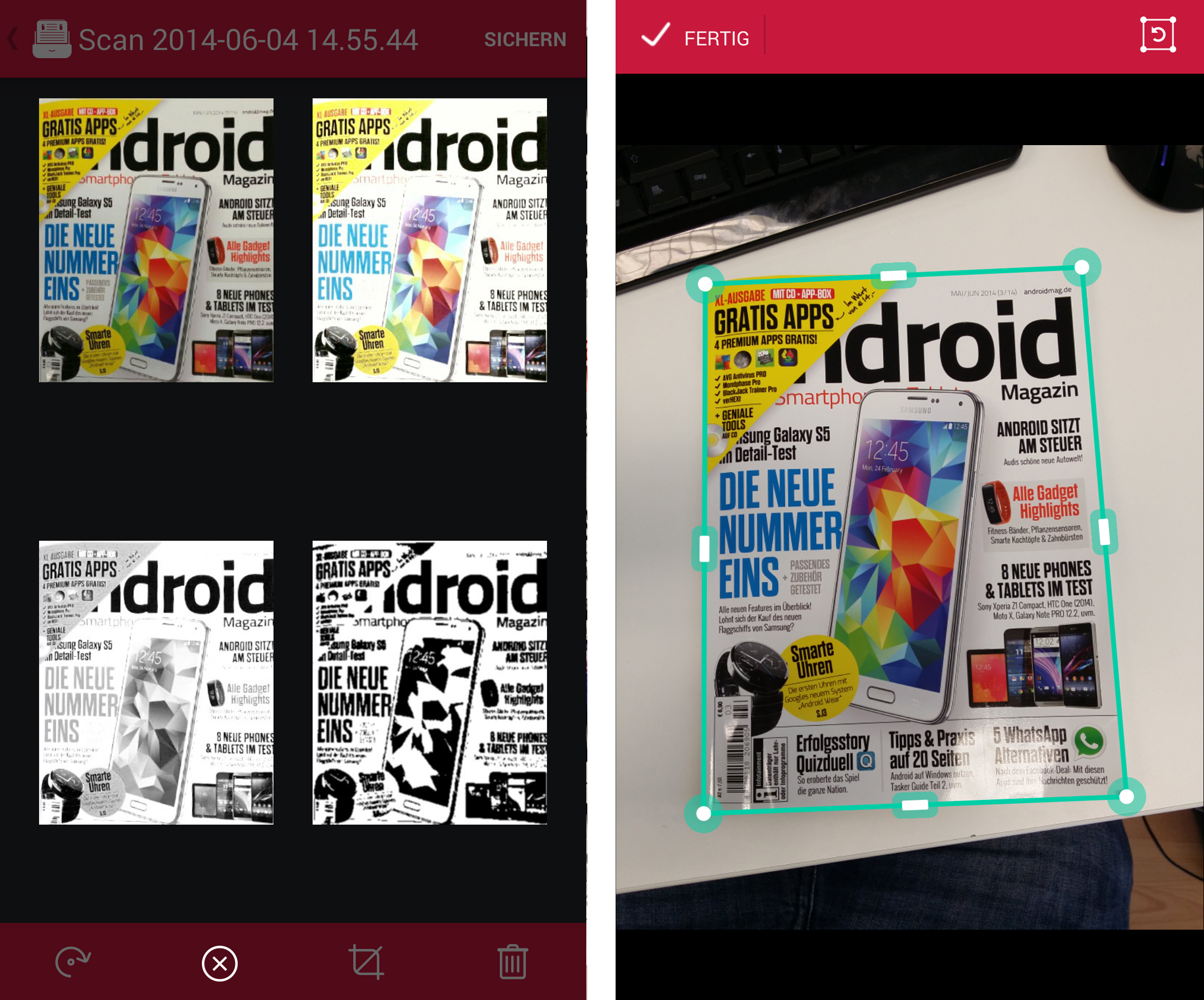 Du kannst aber auch Fotos zuschneiden, z.B. wenn sie bei der Aufnahme nicht automatisch erkannt wurden. Auf diese Weise lässt sich etwa störender Hintergrund entfernen. Beim Festlegen des Ausschnitts kannst du insgesamt acht Ankerpunkte am Dokument platzieren und verschieben. Praktisch auch die Lupe, welche dir die genaue Position eines Ankerpunktes anzeigt.