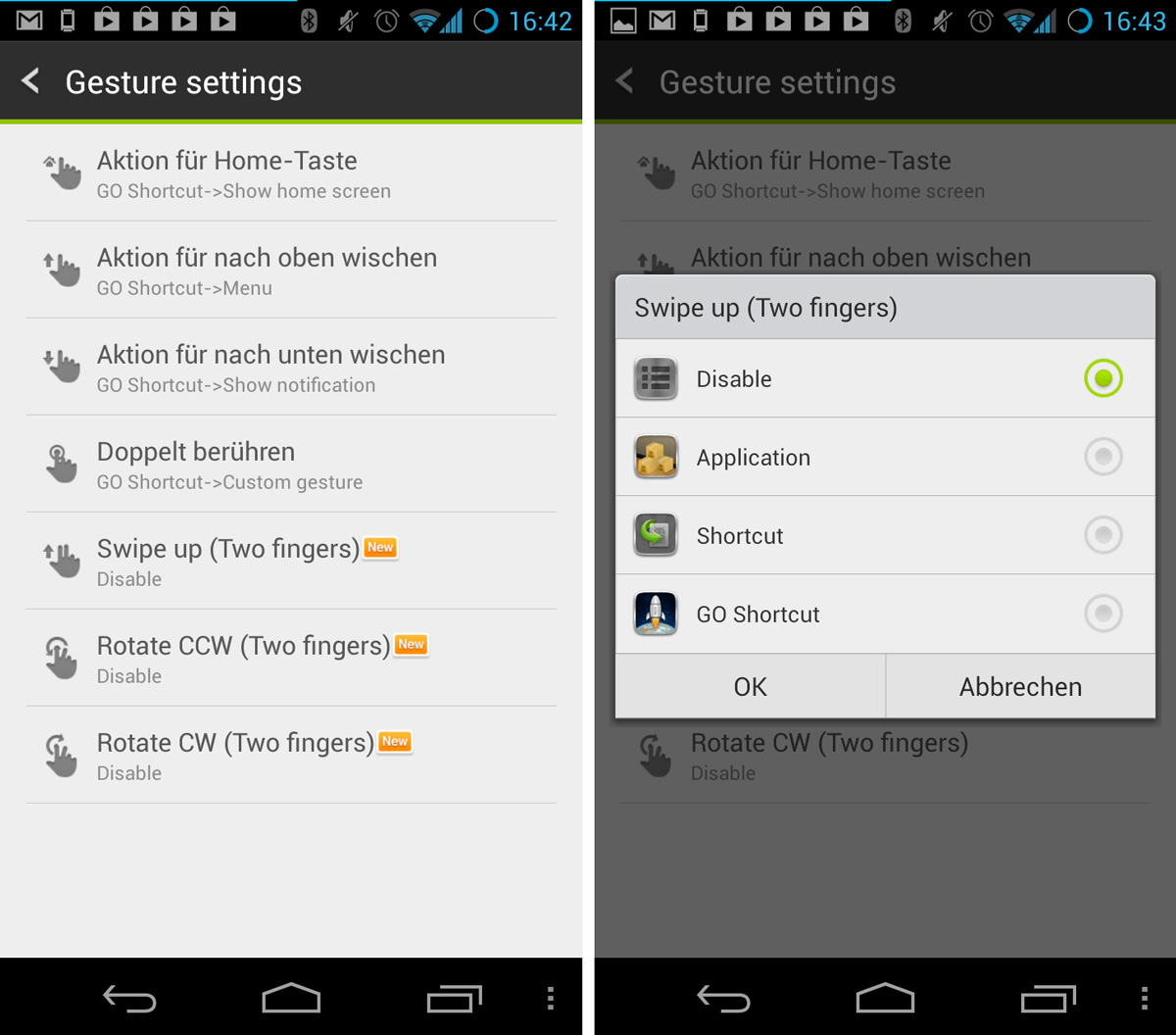 Neu hinzu gekommen sind außerdem spezielle Gesten, die sich mit zwei Fingern auslösen lassen und als Shortcuts zu diversen Apps oder GO Launcher-Menüs genutzt werden können.