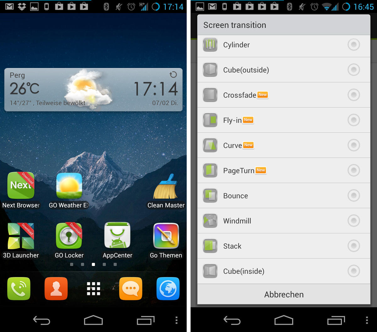 Ein weiteres Extra der Prime-Variante sind die neuen Homescreen-Übergänge „Crossfade“, „Fly-in“, „Curve“ und „PageTurn“. In Anbetracht der unzähligen, bereits vorhandenen, Effekte, ist die Ausbeute an neuen Übergängen etwas mager.